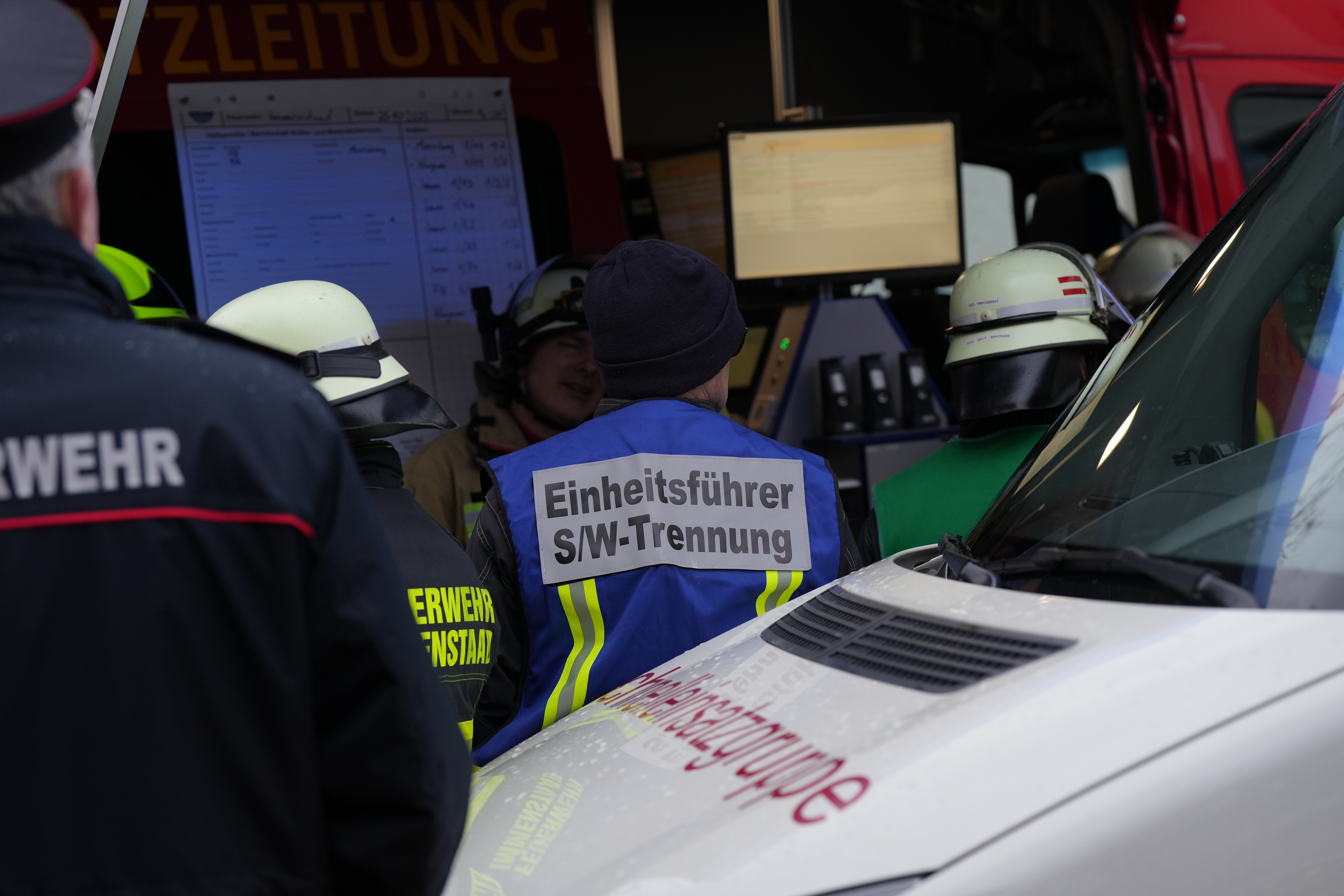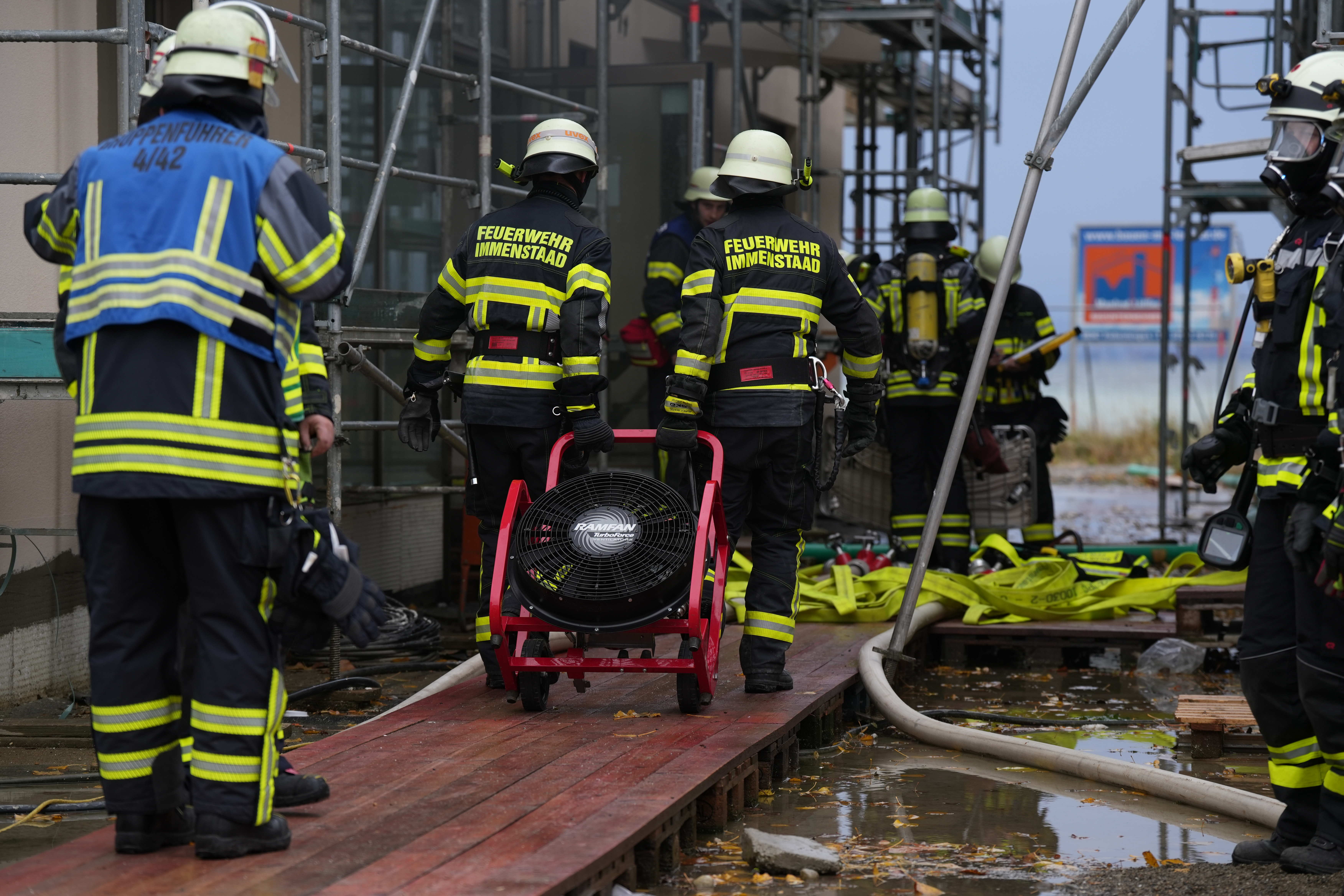 (MM) Für unsere diesjährige Jahreshauptübung wurde in diesem Jahr der zum Teil fertiggestellte Neubau des ehemaligen Gasthaus Schiff in der Seestraße West gewählt. Angenommen wurde ein Brand in der weitläufigen Tiefgarage und eine starke Verrauchung des Treppenhauses in einem der Gebäude. Unglücklicherweise war zudem Bezugstag und somit noch Personen und Handwerker in und um die beiden Gebäude. Aufgrund der Größe des Einsatzes wurde die Einsatzstelle in 4 Abschnitte aufgeteilt. Im ersten Abschnitt war unser HLF sowie ein unterstützendes LF aus Kluftern. Diese beiden Fahrzeuge waren mit der Personensuche und mit der Kontrolle der Wohnungen des ersten Gebäudes beschäftigt. Im zweiten Abschnitt waren unser LF und unsere Drehleiter sowie die Kameraden aus Hagnau mit einem weiteren HLF vertreten. Die beiden Löschfahrzeuge wurden mit der Brandbekämpfung sowie mit der Kontrolle des zweiten Gebäudes beauftragt. Unsere Drehleiter rettete zwei Handwerker von der Dachterrasse des zweiten Hauses. Einer der beiden war aufgrund seiner Verletzungen gehunfähig. Bei der Versorgung der Verletzten wurden wir vom DRK OV Immenstaad unterstützt, die den vierten Einsatzabschnitt bildeten (Abschnitt Sanität). Diese Zusammenarbeit funktionierte wie auch in den Vorjahren wunderbar. Ein besonderes Augenmerk sollte wie vorheriges Jahr auf dem dritten Einsatzabschnitt, der Schwarz-Weiß-Trennung, liegen. Hierfür haben wir lange geplant und konnten die weiteren Fortschritte erfolgreich in der Übung demonstrieren. Der Hintergrund hierbei ist, dass wir uns nach dem Atemschutzeinsatz mit durch Rauchgasen usw. kontaminierten Klamotten möglichst gesundheitsschonend entkleiden und mit den entsprechenden Klamotten und Gerätschaften verfahren können, ohne eine Verschleppung der Kontamination zu riskieren. Das alles tun wir, um langfristig die Gesundheit unserer Einsatzkräfte zu schützen. Wir möchten den überörtlichen Einsatzkräften der umliegenden Feuerwehren sowie dem DRK Immenstaad an dieser Stelle einen großen Dank für die Unterstützung bei unserer Jahreshauptübung aussprechen!