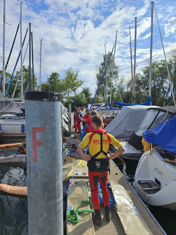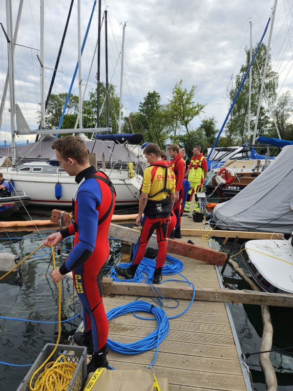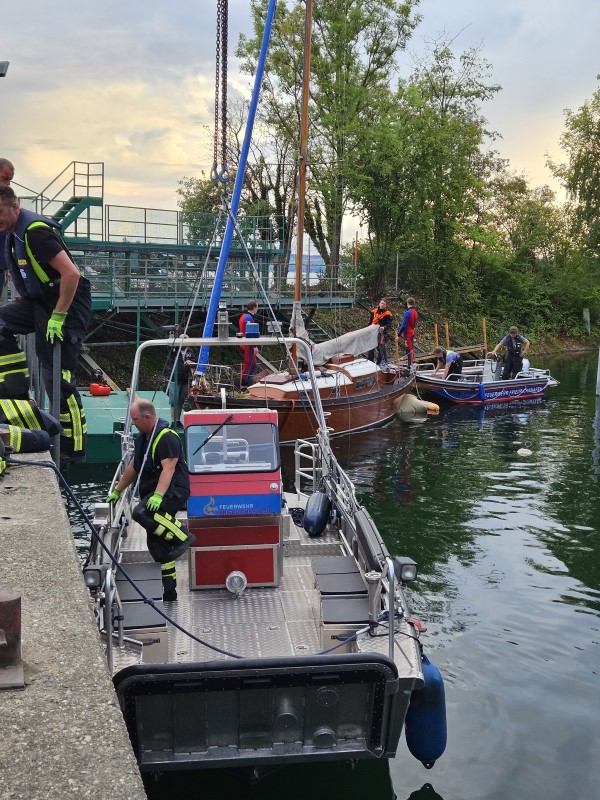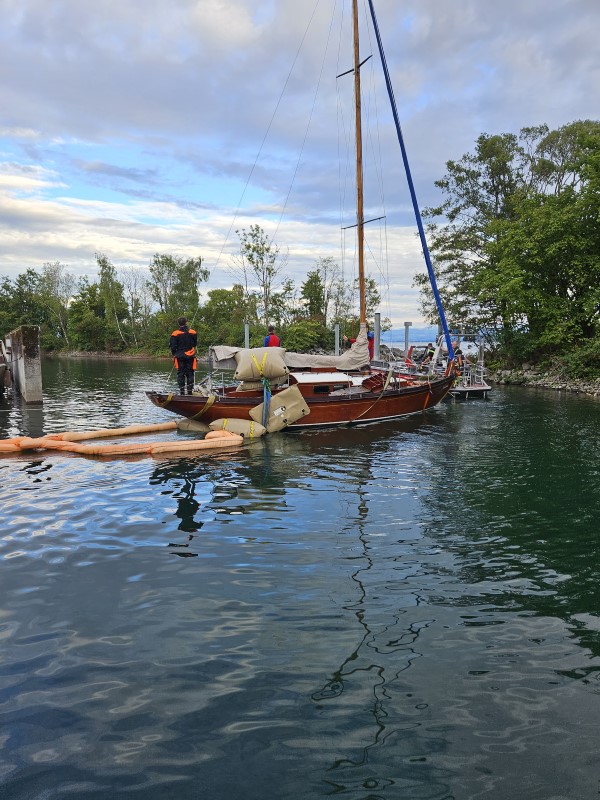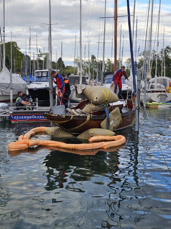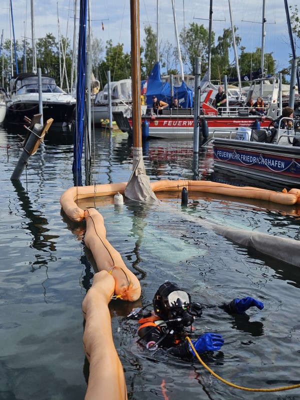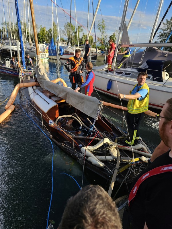 (MR) Am Donnerstagnachmittag wurden wir zu einer gesunkenen Segeljacht alarmiert, aus der Betriebsstoffe austraten. Vor Ort stellten wir in Zusammenarbeit mit Einsatzkräften der Feuerwehr Friedrichshafen, der Polizei und der Tauchergruppe der DLRG zunächst sicher, dass die austretenden Stoffe mittels Ölsperren aufgenommen werden konnten. Zudem wurde die Segeljacht im weiteren Verlauf des Einsatzes mit vereinten Kräften geborgen und außerhalb des Gefahrenbereichs verbracht. Wir bedanken uns bei allen Einsatzkräften vor Ort für die gute Zusammenarbeit.