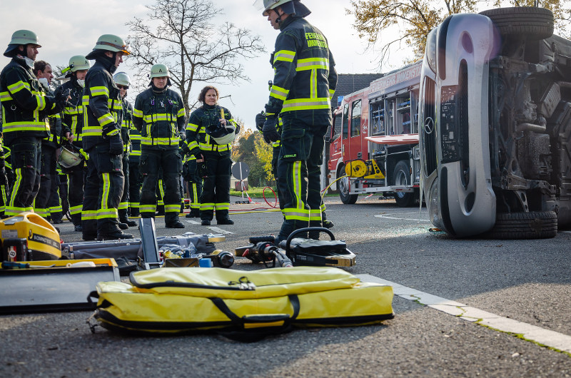 Nach einer kurzen Mittagspause ging es dann gegen 13 Uhr in die Praxis. An drei Stationen wurden verschiedene Techniken an einem stehendem, einem seitlich und einem auf dem Dach liegenden Fahrzeug beübt. Durch die ständigen Veränderungen im Fahrzeugbau müssen sich auch die Ansatzpunkte für die Rettung und Vorgehensweisen anpassen. Anhand der Übungen konnte unter fachkundiger Anleitung manch neue Technik erlernt, bekanntes aufgefrischt und bisher lediglich in der Theorie bekanntes in der Praxis vertieft werden.
