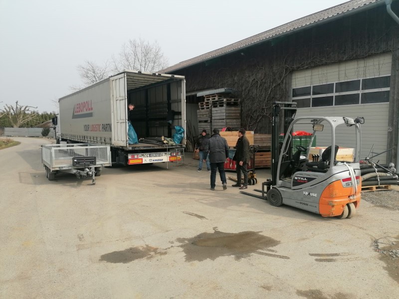 Anschließend kamen die fertig gepackten Paletten und Gitterboxen (18 insgesamt) zu Klaus Berger in die Maschinenhalle, da dort der Lastwagen mehr Platz zum parken hatte und ein Gabelstapler für das Verladen vorhanden war.
