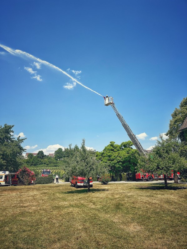 (MR) Im Juni unterstützten wir die Jahreshauptübung der Feuerwehr Hagnau. Wir waren mit der Drehleiter und dem HLF vor Ort dabei. Die uns zugeteilten Aufgaben umfassten den Aufbau von zusätzlicher Wasserversorgung und Personenrettung mithilfe der Drehleiter.