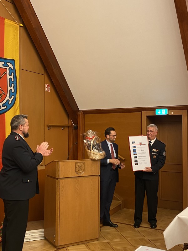 Claus Mecking erhielt bei seinem altersbedingten Übertritt in die Altersmannschaft nach einer beispiellosen Laufbahn in der Freiwilligen Feuerwehr Immenstaad unter großem Applaus die Ehrung zum Ehrenkommandant.