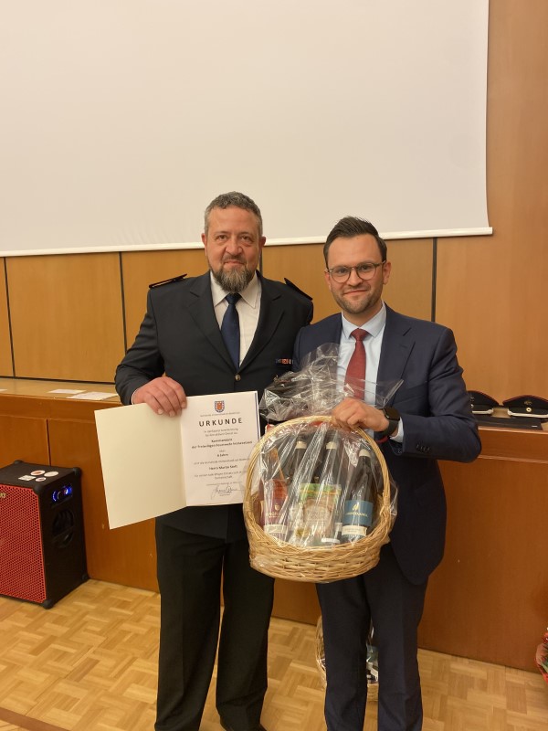 Nach den Grußworten des Stv. Kreisbrandmeisters Michael Fischer und des DRK Immenstaad verlieh Bürgermeister Henne dem aus dem Amt scheidenden Kommandanten Martin Stett eine Urkunde der Gemeinde als Zeichen der Dankbarkeit und Anerkennung für die 6-jährige Tätigkeit als Kommandant der Freiwilligen Feuerwehr Immenstaad.