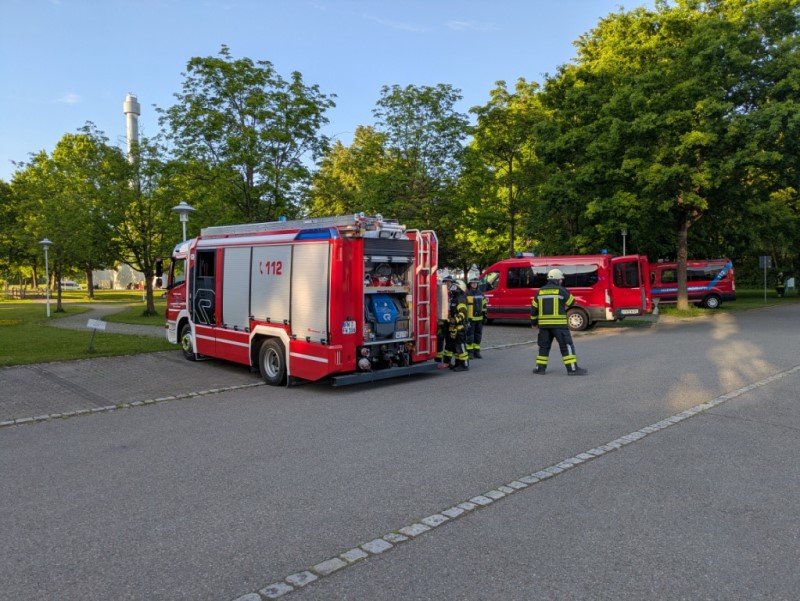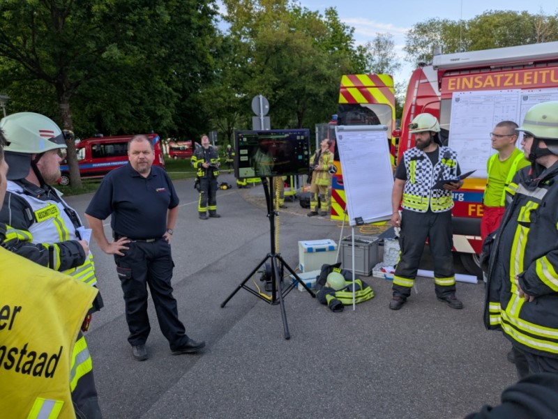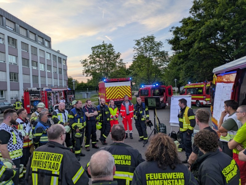 (CM) Am 19.05.2025 führte die Freiwillige Feuerwehr Immenstaad zusammen mit ihren Nachbarwehren eine Großübung im Industriepark TRIWO, im östlichen Gemeindegebiet Immenstaads durch. Nach Vorbesprechungen mit der Fa. Hensoldt wurde in einer großen Fertigungshalle des Betriebs ein Großfeuer mit, im Anschluss vermissten Personen, angenommen. Aufgrund des Meldebildes wurden Einsatzkräfte der Feuerwehren Friedrichshafen-Fischbach, Hagnau, Werkfeuerwehr Airbus, Drohnengruppe der Feuerwehren aus dem Bodenseekreis und der Führungsgruppe aus dem Unterstützungsbereiches, mit alarmiert bzw. nachgefordert. Die Johanniter-Unfall-Hilfe unterstützte hierbei, um verletzte Mitarbeiter und Feuerwehrangehörige versorgen zu können. Ziel der Übung war das Zusammenwirken von rund 100 Einsatzkräften unter einer gemeinsamen Einsatzleitung zu erproben.