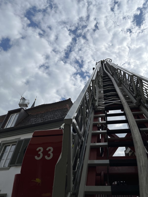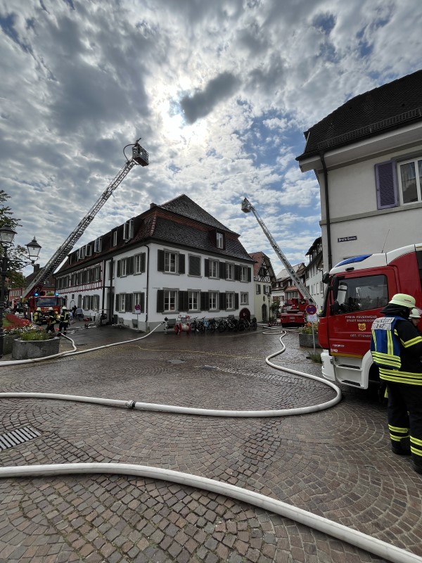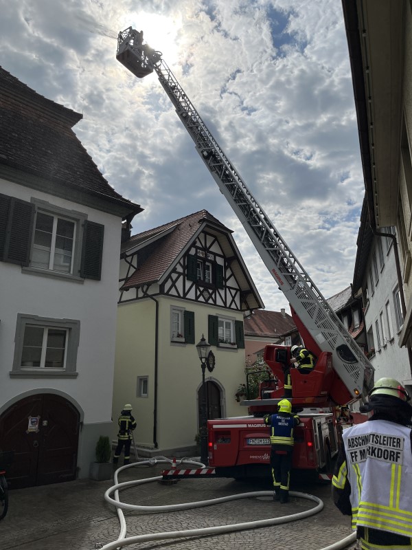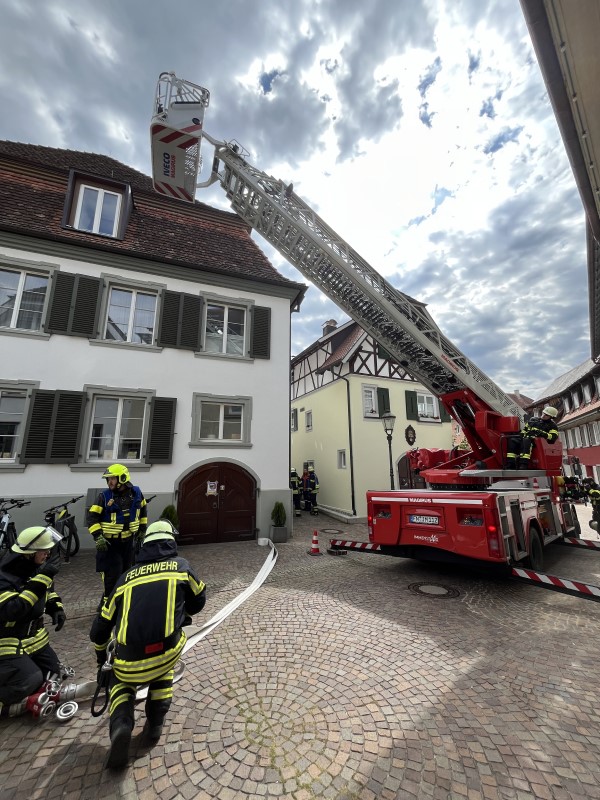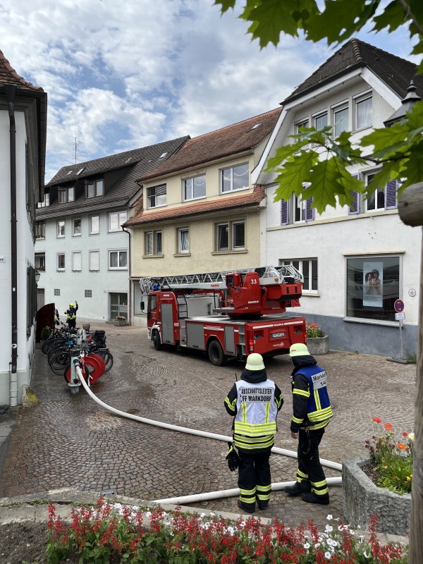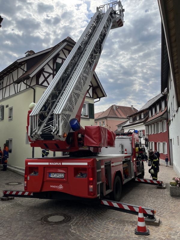 (MR) Am Samstag unterstützten wir die Jahreshauptübung der Freiwilligen Feuerwehr Markdorf. Als Übungsszenario wurde ein Brandeinsatz in der mittleren Kaplanei in der Kirchgasse angenommen. Wir waren mit unserer Drehleiter vor Ort und unterstützten die Brandbekämpfung von außen.