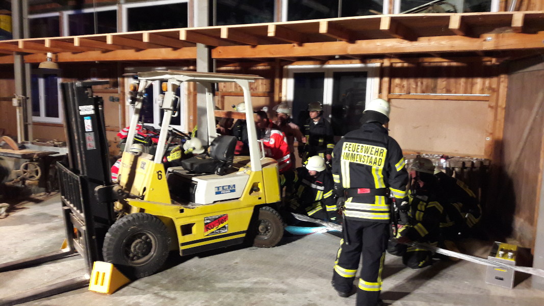 Beim zweiten Szenario wurde bei Arbeiten in einem Betrieb ein Arbeiter zwischen einem Gabelstapler und einem Stützpfeiler eingeklemmt. Das DRK übernahm die medizinische Versorgung während die Feuerwehr die Befreiung durchführte. Auch hier war es Ziel die Zusammenarbeit zu üben. Zusätzlich wurde der Umgang mit verschiedenem technischen Gerät wiederholt.