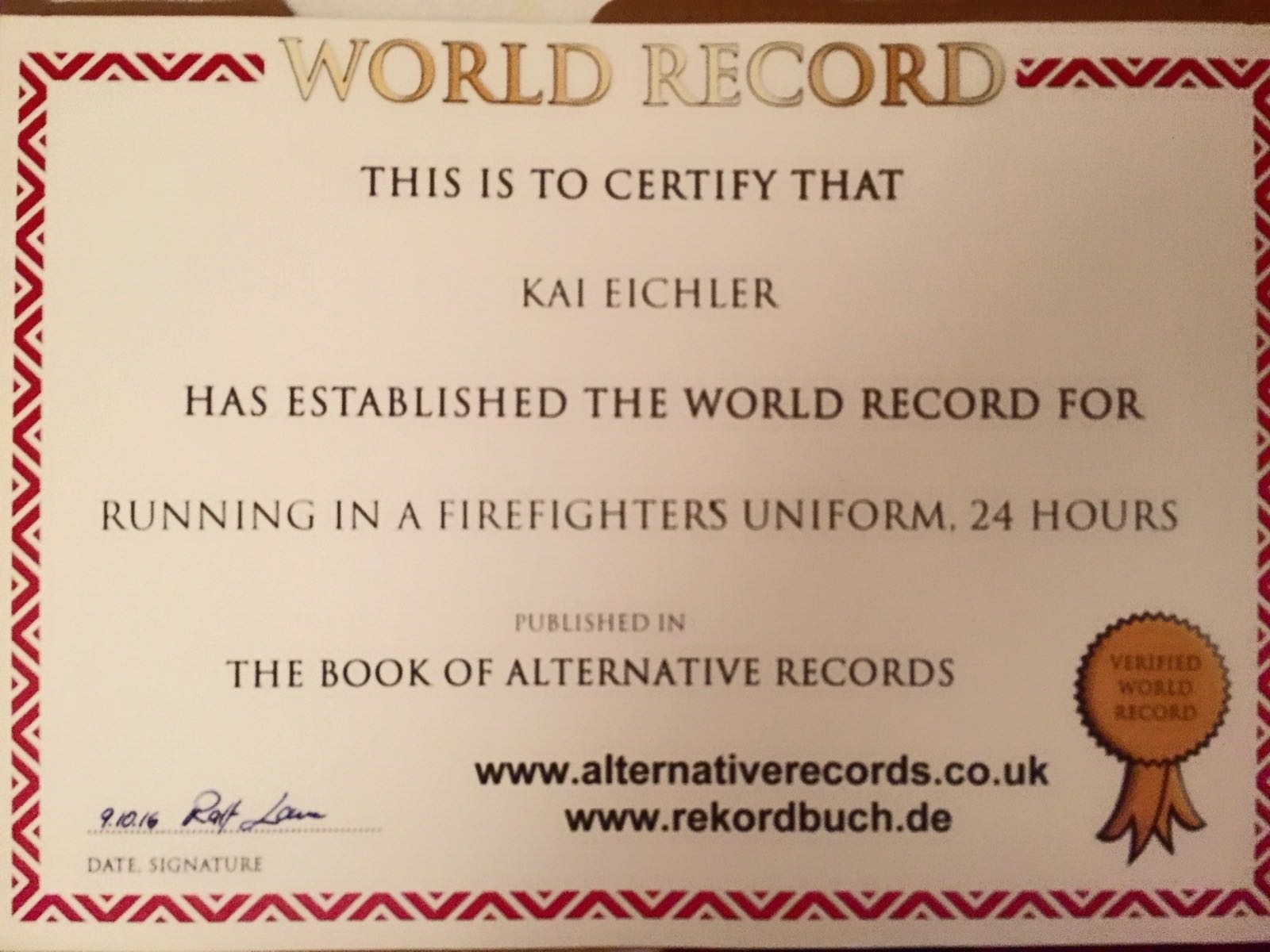 Kai: Nachdem ich den angestrebten Rekord nicht erreicht hatte, wurde ich von einem Vertreter eines anderen Rekordinstituts angeschrieben der von meinen Ambitionen gehört hatte. Er war von meiner Leistung angetan. Nach einer ausführlichen Prüfung bekam ich den Eintrag als längsten Lauf innerhalb 24 Stunden in Einsatzkleidung beim "The Book of Alternative Records".