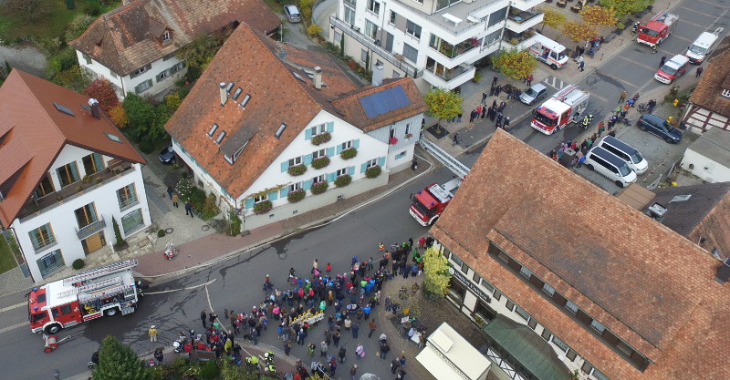 Als Übungsobjekt diente dieses Jahr das Haus der Familie Max Rauber in der Hauptstraße von Immenstaad. Das in mehrerer Hinsicht interessante Gebäude beherbergt unter anderem bis zu 16 Feriengäste. Historisch bedingt steht das Haus eng zu anderen Wohngebäuden im Ortskern. Entsprechend groß sind auch die Anforderungen für die Feuerwehr. In dem zweigeschossigen Haus stellt das Treppenhaus den ersten und Aussenfenster und Balkone den zweiten Rettungsweg dar.