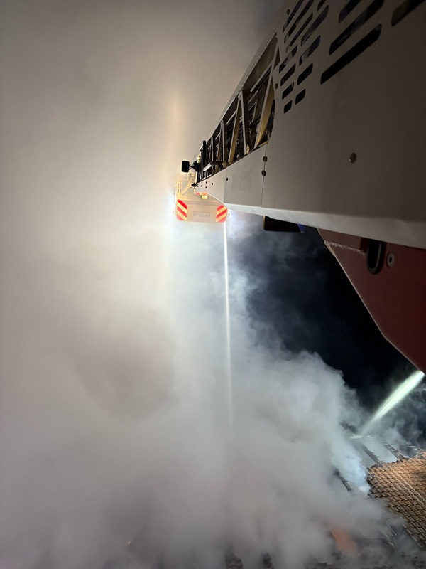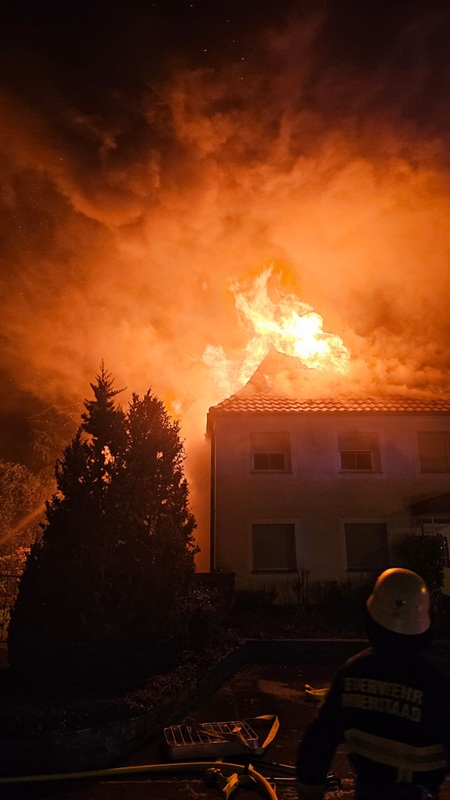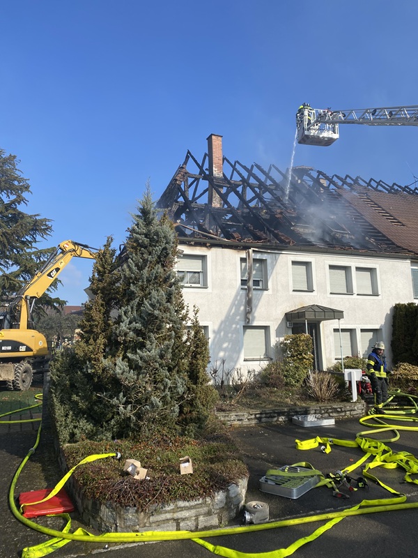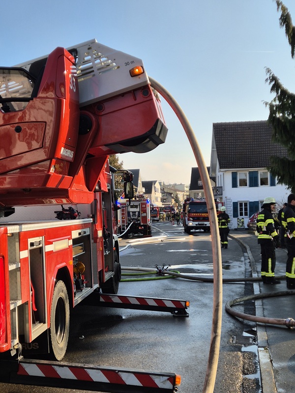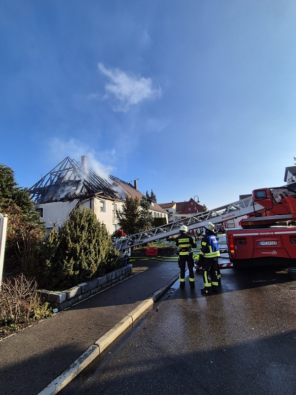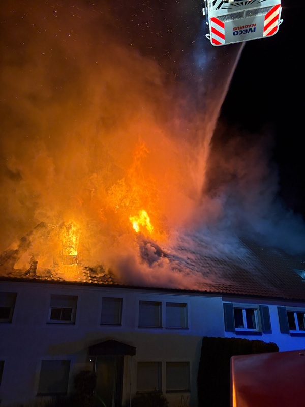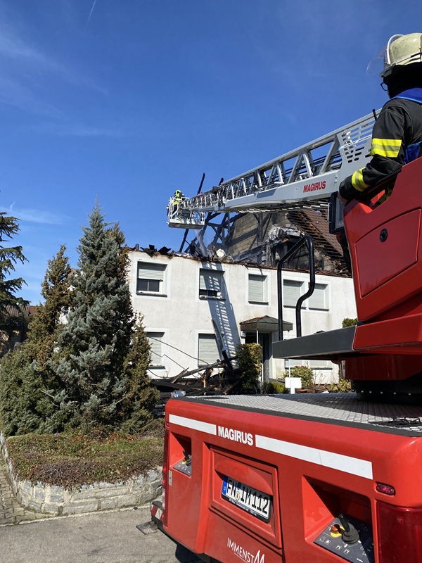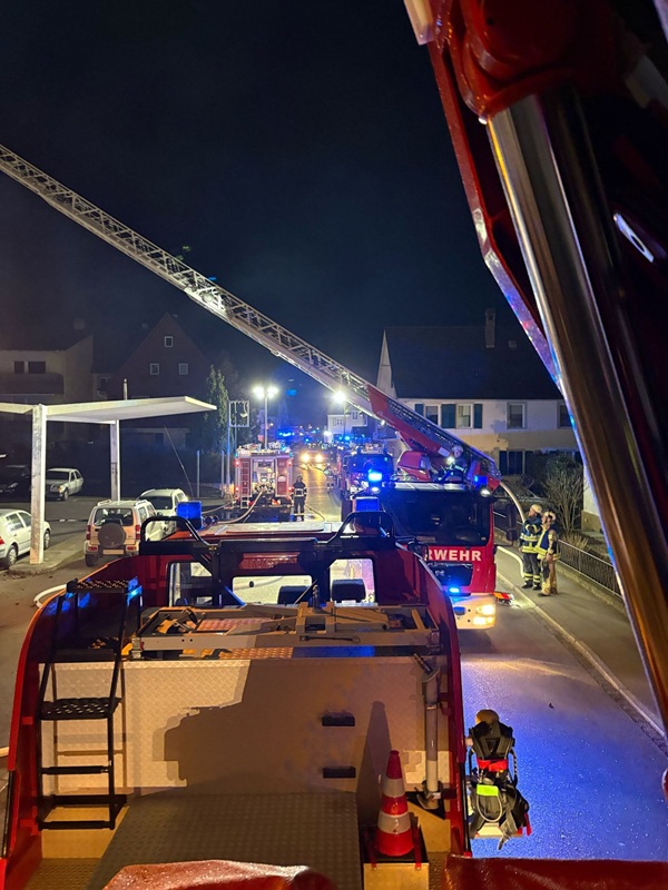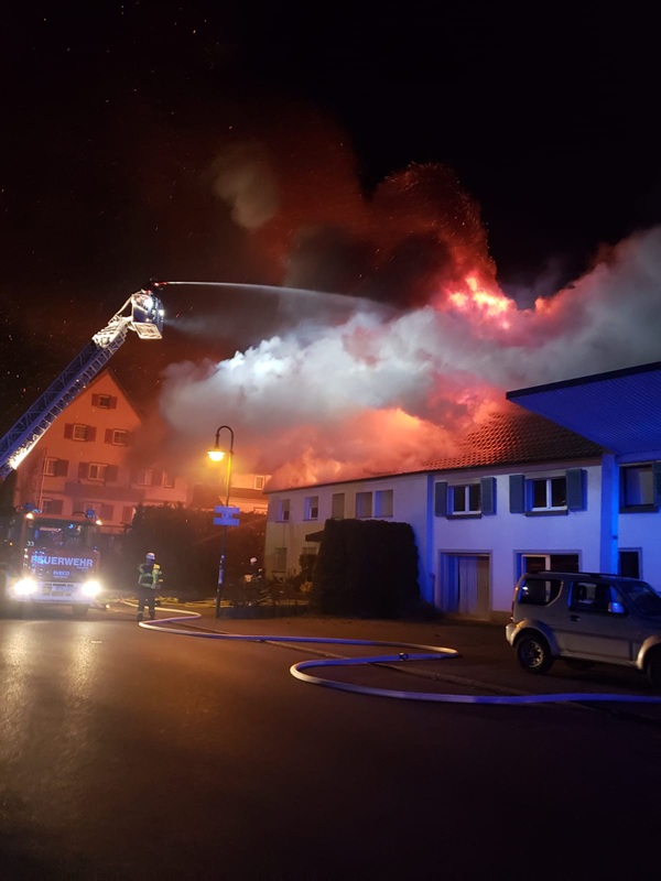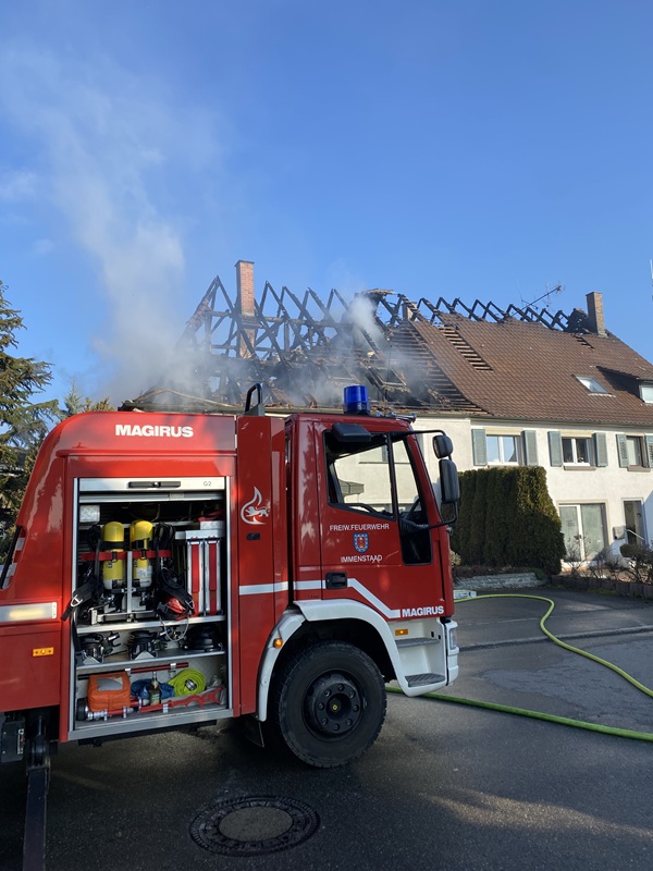 (MR) In der Nacht von Samstag auf Sonntag wurden wir zu einem Brand im Dachstuhlbereich eines Mehrfamilienhauses alarmiert. Die linke Gebäudehälfte stand bei unserem Eintreffen bereits im Vollbrand. Über das Dach griff das Feuer zudem auf die rechte Gebäudeseite über. Eine vermisste Person in der linken Gebäudeseite konnte leider nur noch geborgen werden nachdem die Löscharbeiten weiter fortgeschritten waren. Im Einsatz befanden sich rund 100 Einsatzkräfte von freiwilligen Feuerwehren. Vor Ort waren die Feuerwehren Hagnau, Fischbach, Stetten, Meersburg, Uhldingen-Mühlhofen, Daisendorf, Friedrichshafen, Markdorf sowie die Führungsgruppe des Unterstützungsbereiches und der 3. stv. Kreisbrandmeister Dagobert Heß. Der Rettungs- und Sanitätsdienst von der Schnell-Einsatz-Gruppe des DRK Immenstaad und der JUH Friedrichshafen sowie die Psychosoziale Notfallversorgung Bodenseekreis waren mit rund zwei dutzend Einsatzkräften vertreten. Die Polizei und Bürgermeister Henne waren ebenfalls mit vor Ort. Außerdem wurde im Verlauf des Einsatzes eine Fachfirma hinzugezogen, um den Teilabbruch des Dachstuhls durchzuführen. Zur Sicherheit wird im weiteren Verlauf eine Brandwache gestellt. Weitere Details sind dem Bericht des Polizeipräsidiums Ravensburg zu entnehmen.