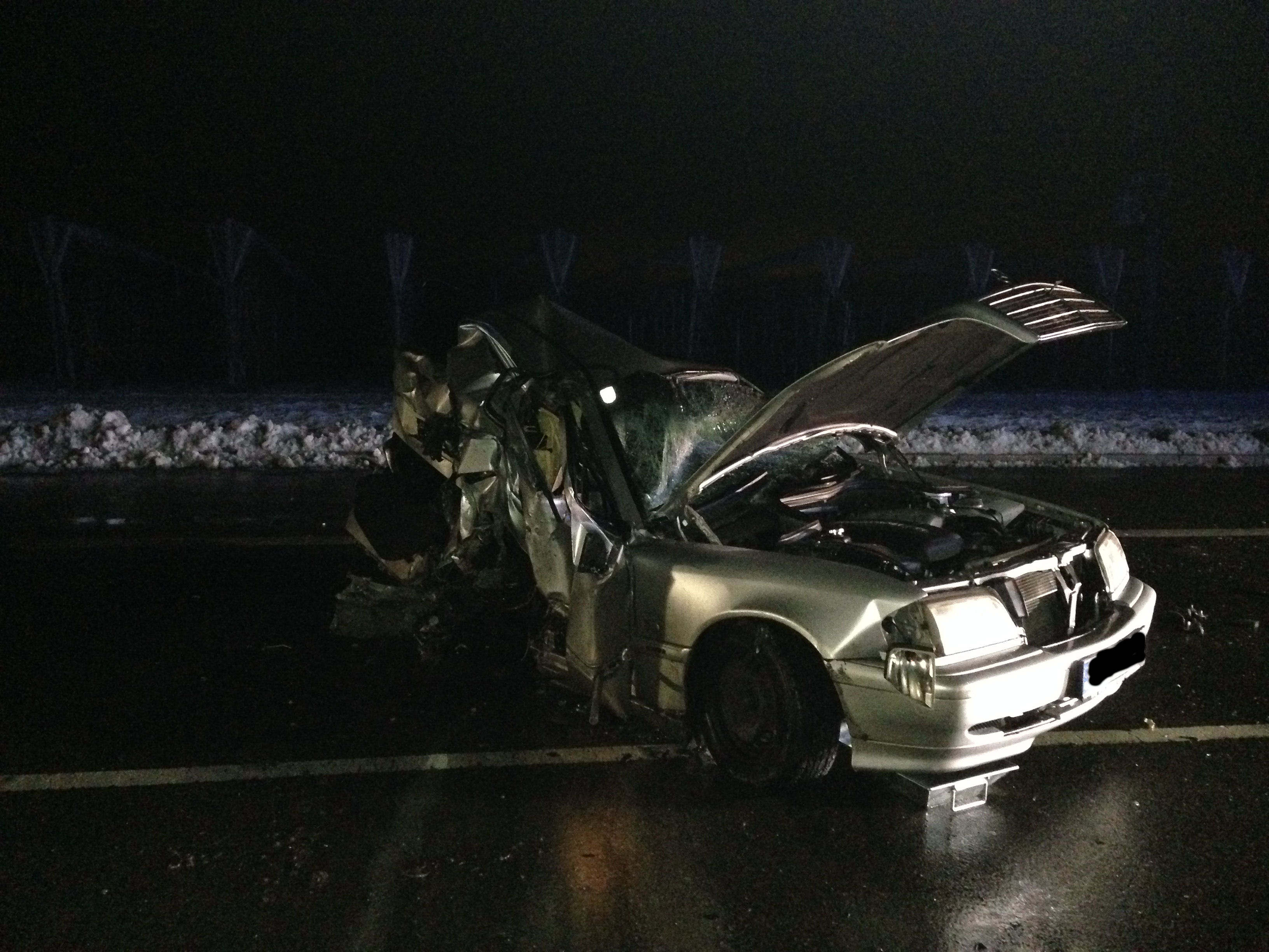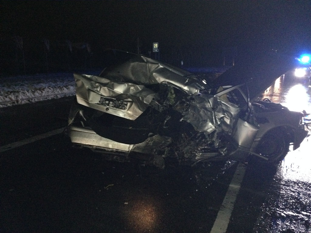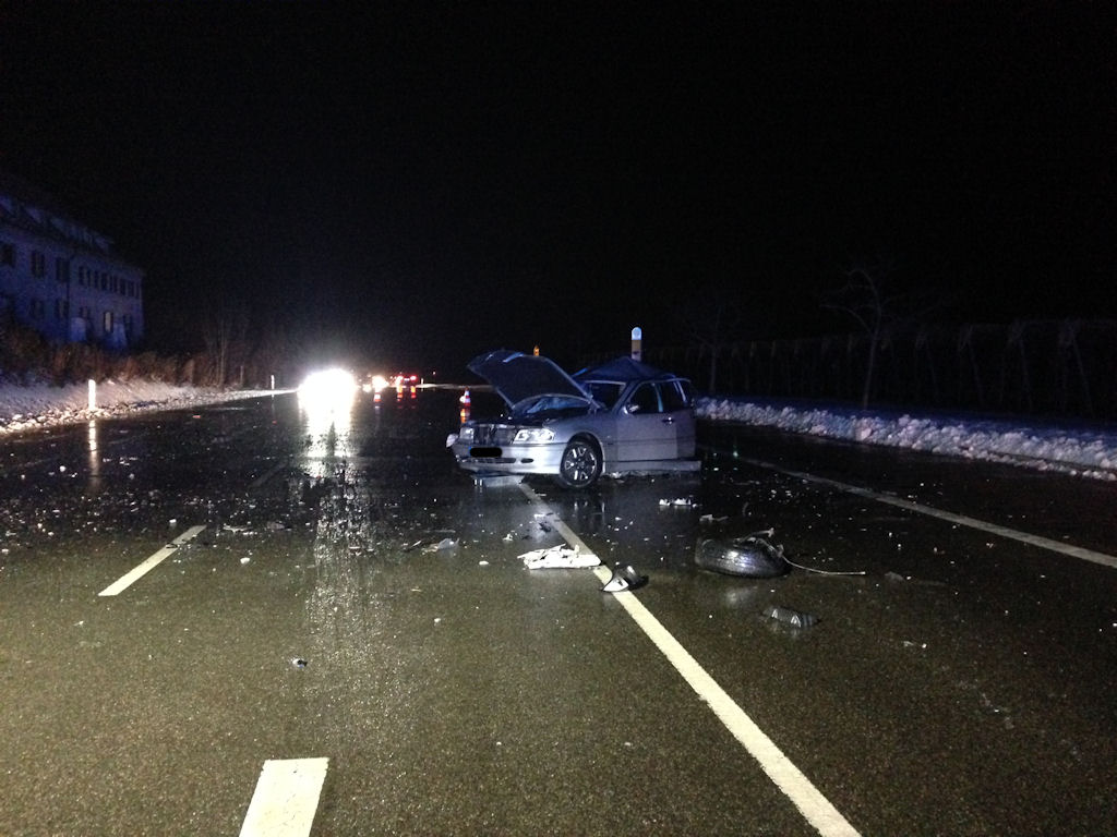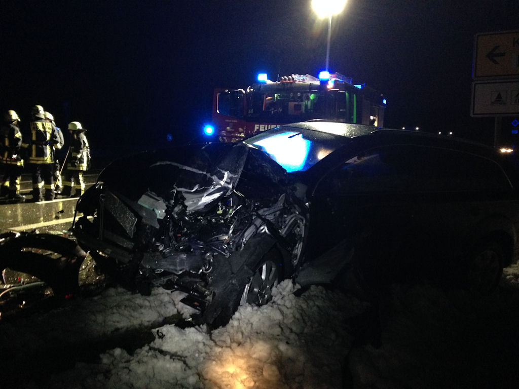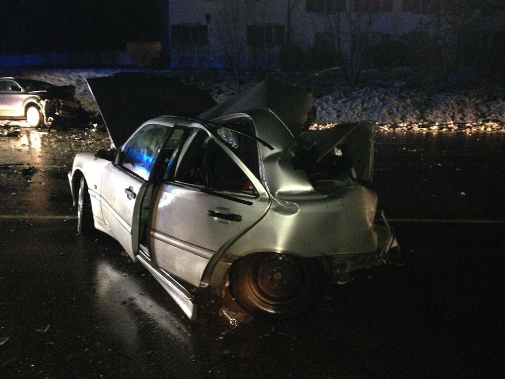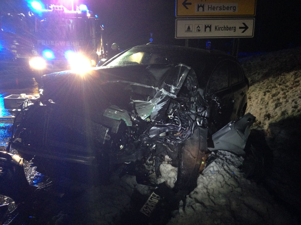 Gegen 21 Uhr geriet ein in Richtung Hagnau fahrender PKW ins Schleudern, geriet auf die Gegenfahrbahn und kollidierte Rückwärts mit einem entgegenkommenden SUV. Der PKW-Fahrer konnte sich trotz seiner Verletzungen und Mithilfe von Unfallzeugen aus dem Fahrzeug befreien.