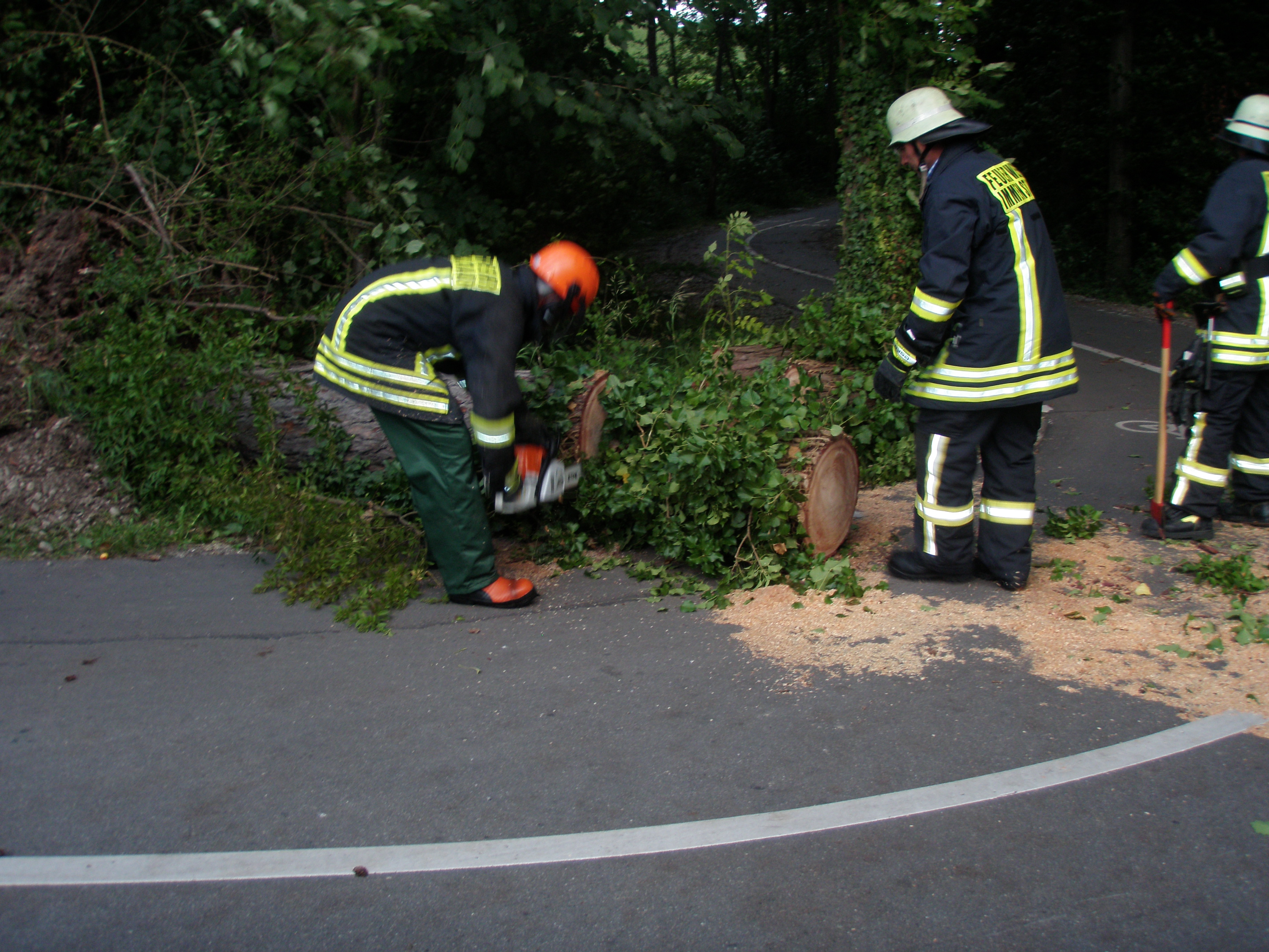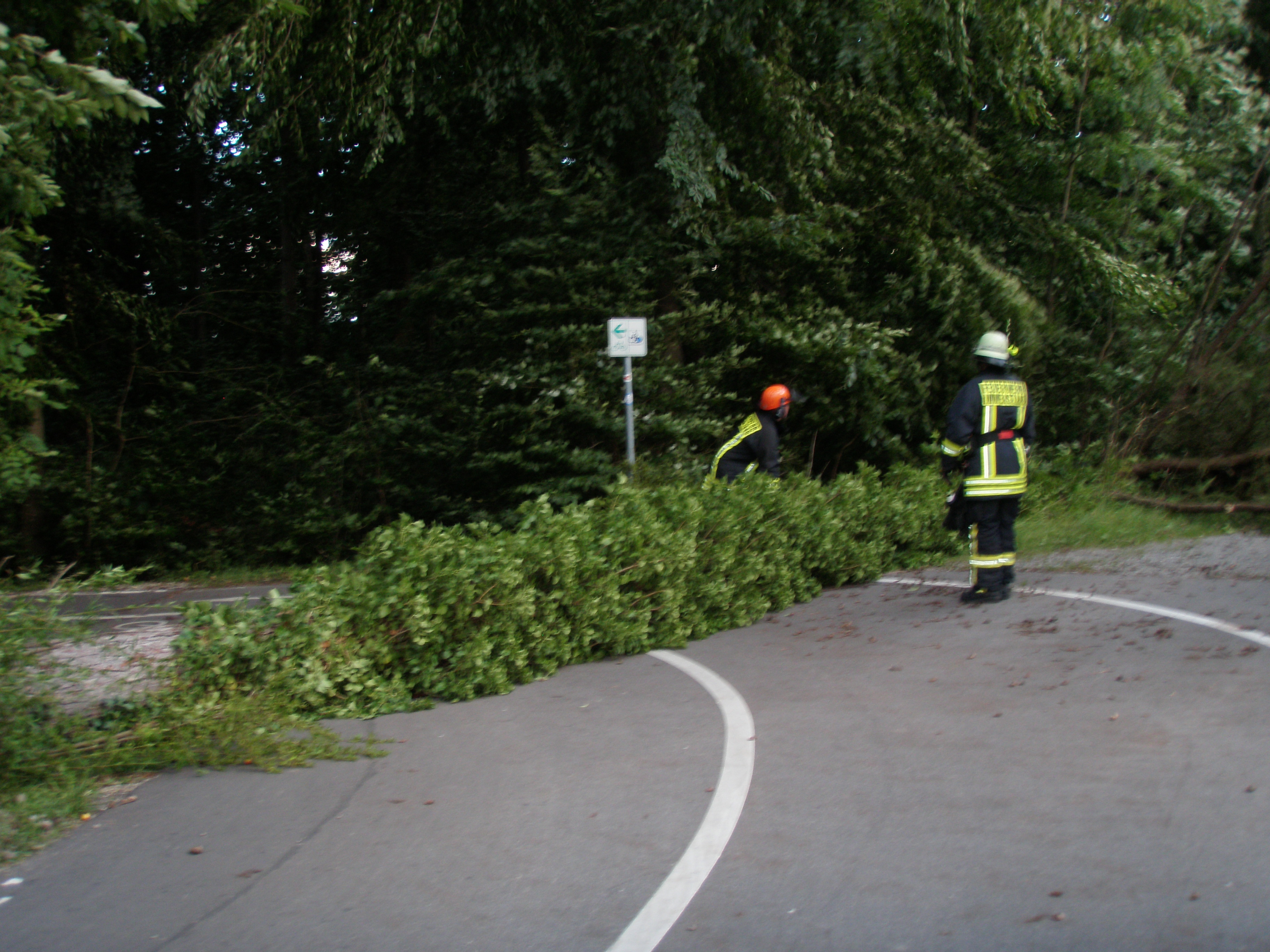 Infolge starker Winde war ein Baum auf einen Radweg gestürzt. Die angerückte Mannschaft zersägte den Baum und beseitigte die Gefahr auf dem Weg.