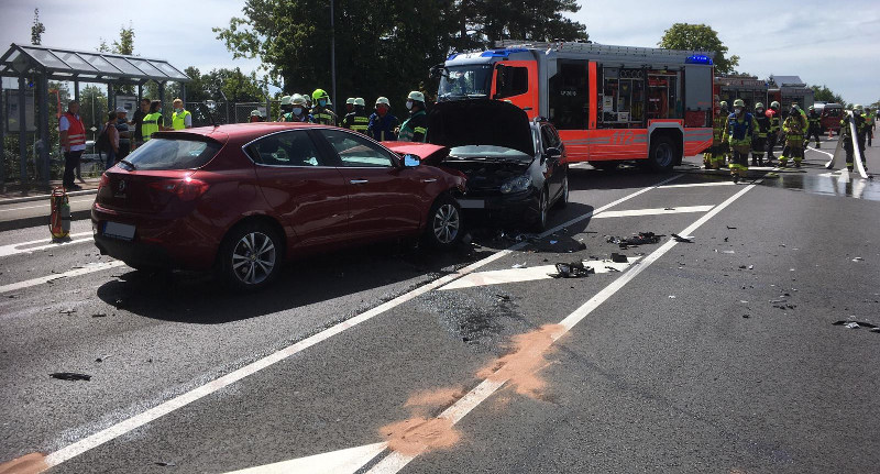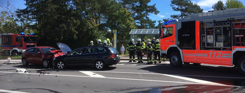 (MM) Am Mittwoch um die Mittagszeit wurde die Feuerwehr Immenstaad zu einem Verkehrsunfall alarmiert. Gemeldet wurde ein Frontalzusammenstoß mit brennendem PKW auf der B31. Vor Ort hatte die Werkfeuerwehr, der angrenzenden Firma Airbus, bereits den Löschangriff auf den brennenden PKW gestartet, zwei weitere unfallbeteiligte PKW standen in sicherer Entfernung.