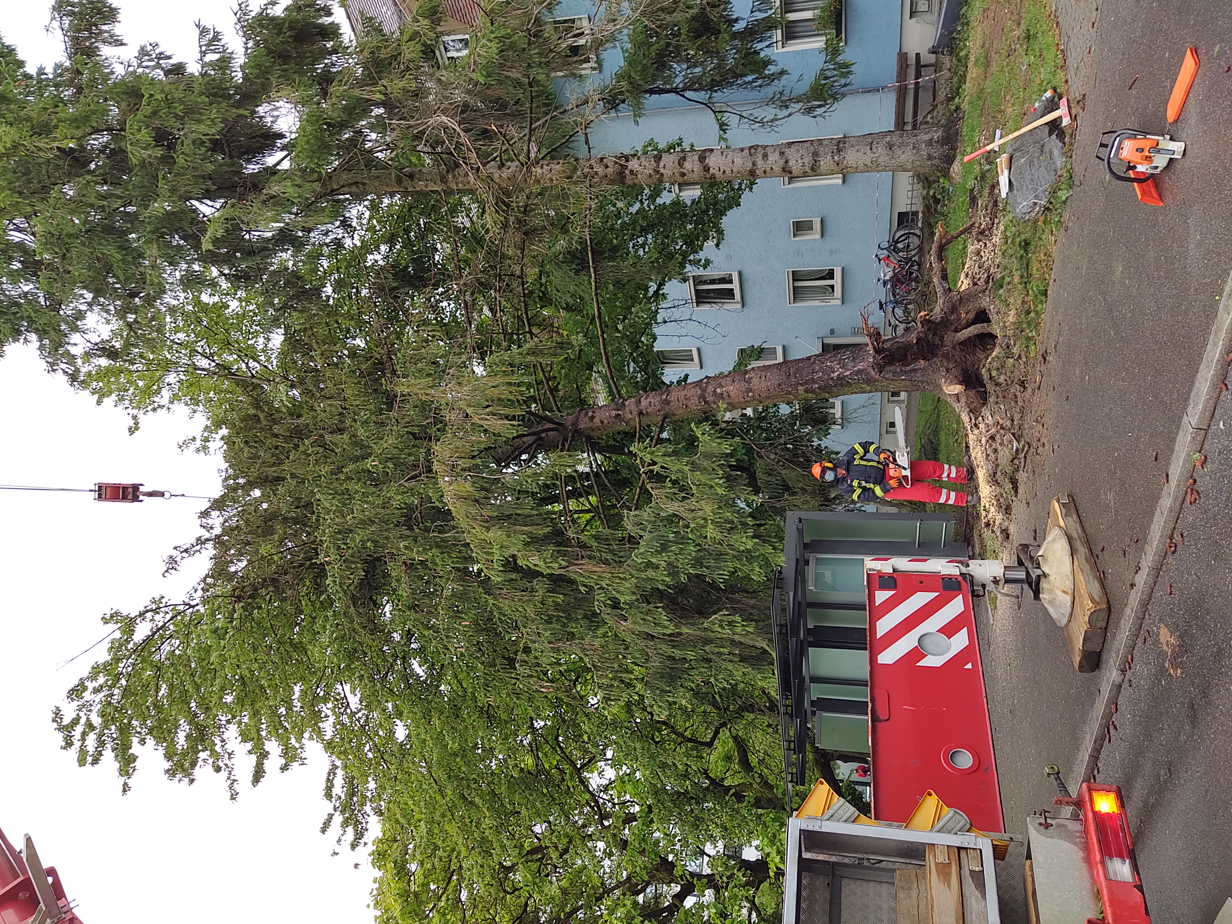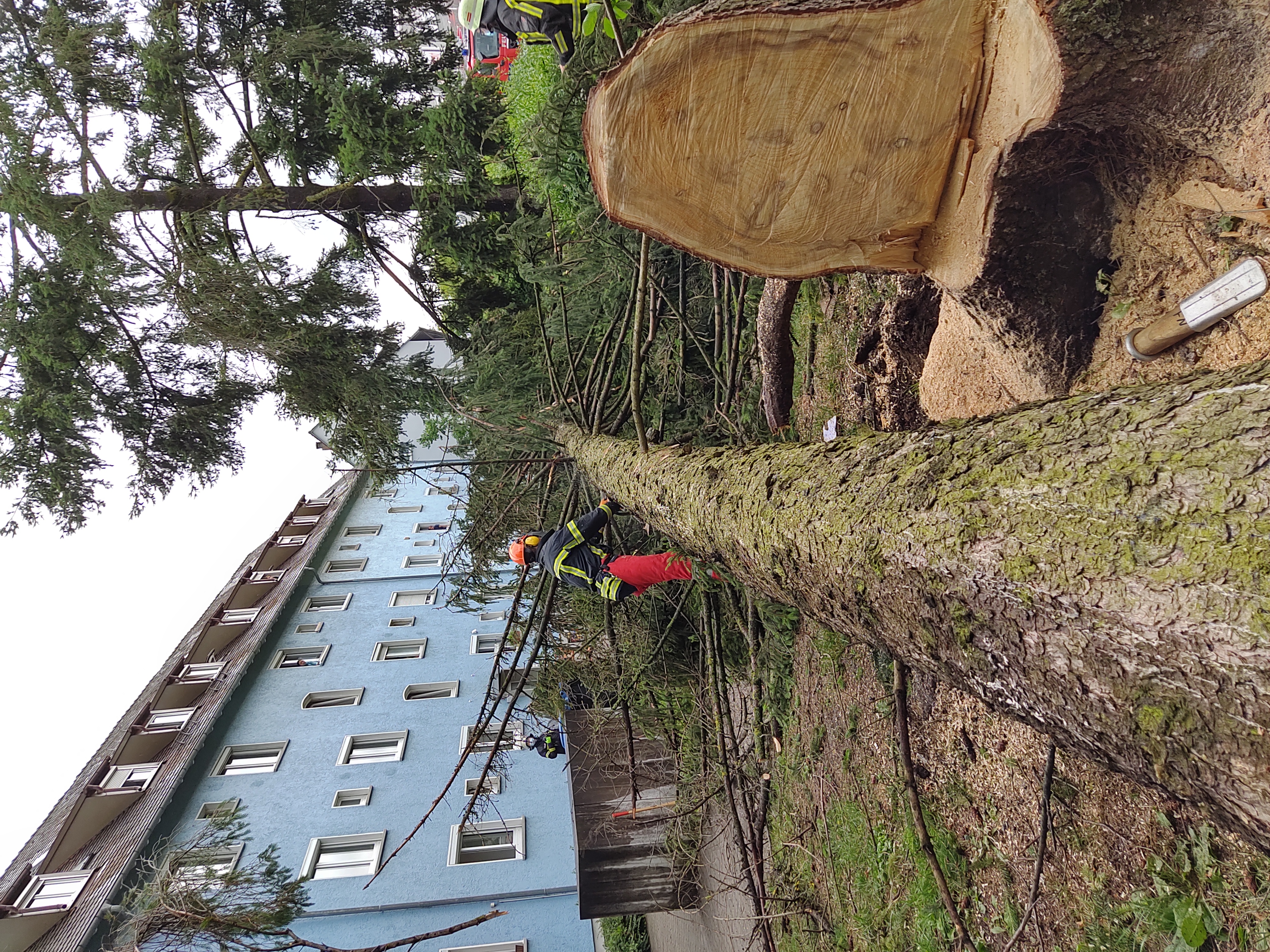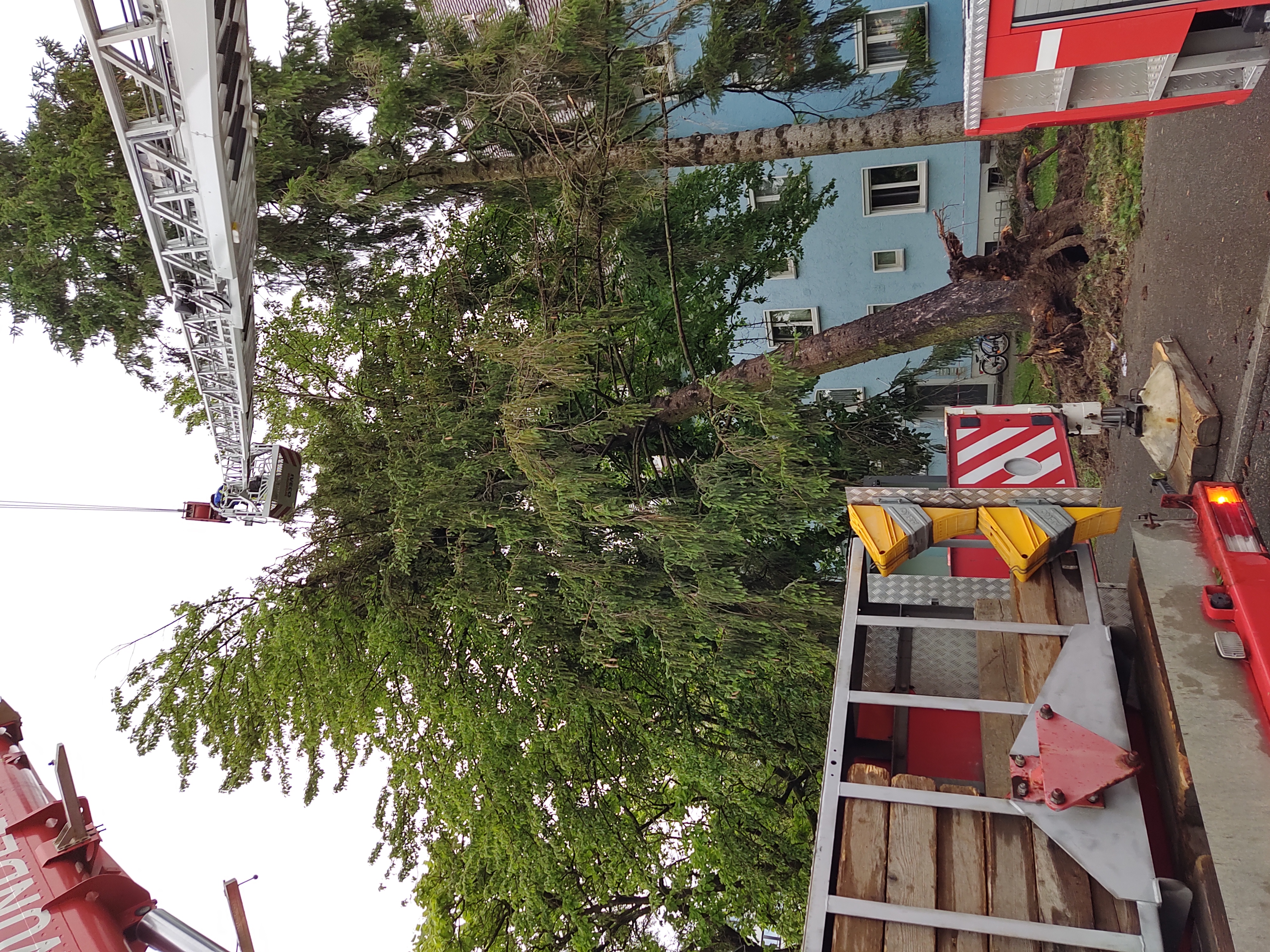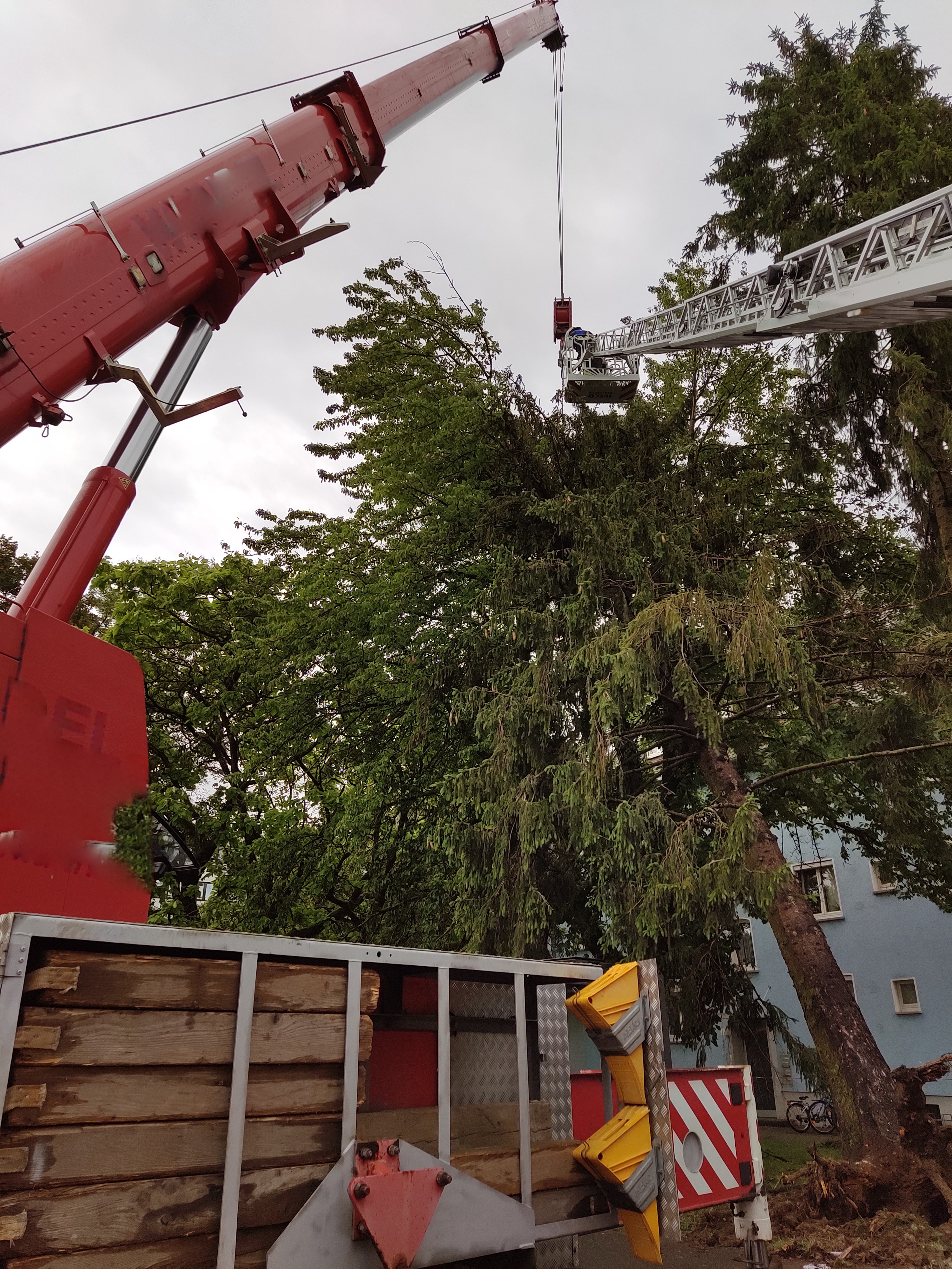 (MR) Der dritte Einsatz des Tages entführte unsere Drehleiter ein weiteres Mal nach Friedrichshafen, wo ein größerer Baum bereits umzufallen drohte. Vor Ort konnten wir mit vereinten Kräften der Feuerwehr Friedrichshafen und durch externe Bereitstellung eines Autokrans auch diese Gefahr abwenden und den Baum sicher zu Fall bringen.