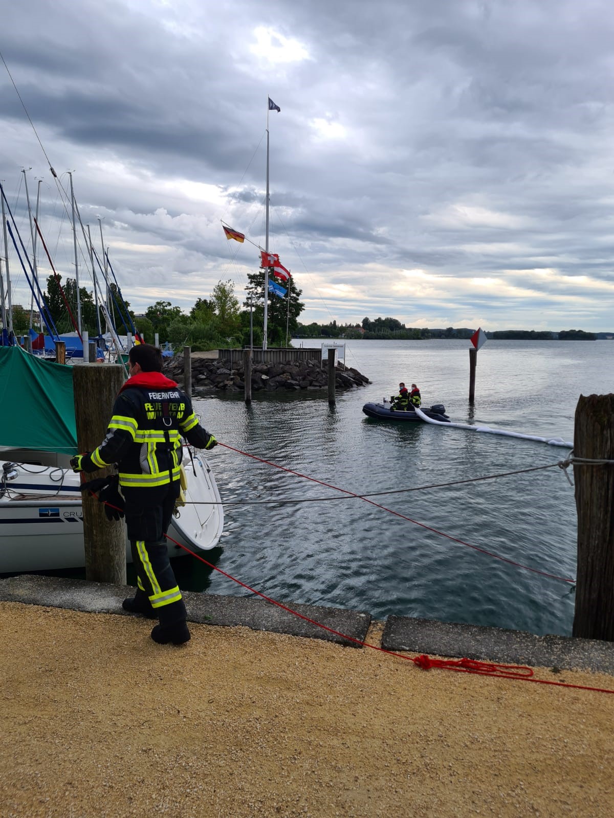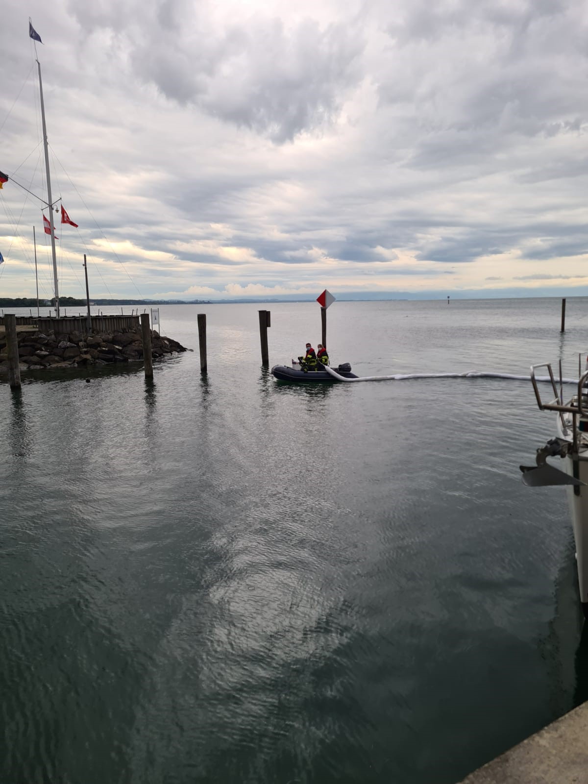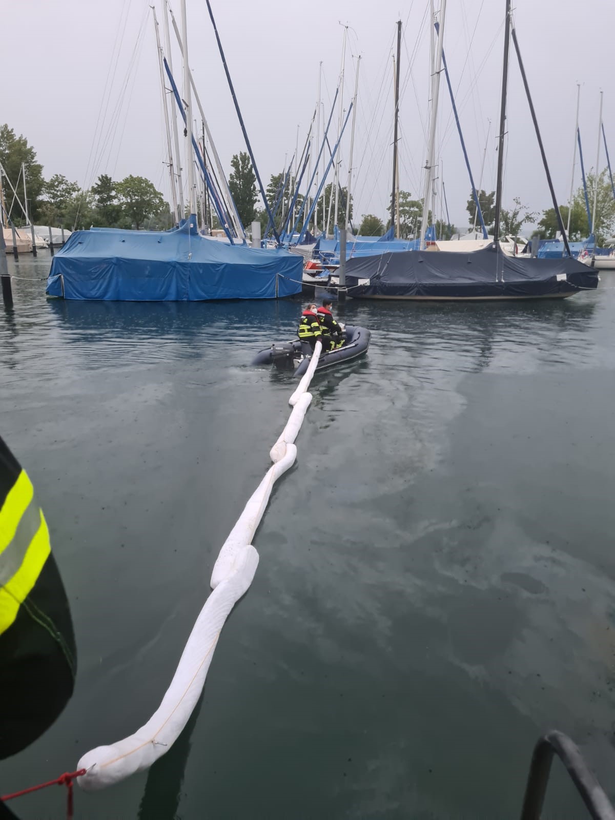 (MR) Am Dienstagabend wurde zunächst einer unserer Kommandanten zur Abklärung der Lage im Yachthafen alarmiert, da dort ein größerer Ölfilm sichtbar war. Infolge dessen rückten wir noch mit dem GW-T aus und konnten die betroffene Wasserfläche eingrenzen. Nach einer längeren Wartezeit wurde der ursprünglich aus einem Boot ausgetretene Diesel von einem externen Dienstleister fachgerecht abgepumpt. Die Ölsperren blieben zur Überprüfung bis zum nächsten Morgen.