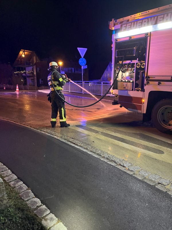 (MR) Am späten Mittwochnachmittag wurden wir über die Polizei zu einer großflächigen Verschmutzung der Fahrbahn im Gemeindegebiet alarmiert. Um die Griffigkeit des Fahrbahnbelags wieder herzustellen beseitigten wir die Verunreinigung. Im Anschluss an die Arbeiten rückten wir wieder ein.