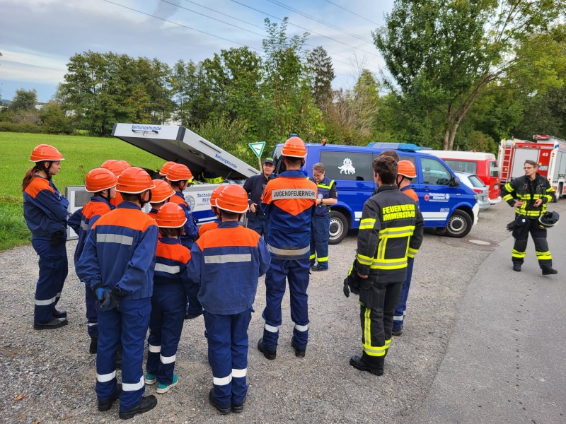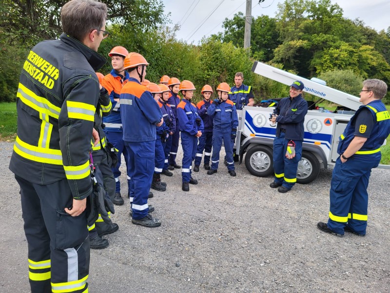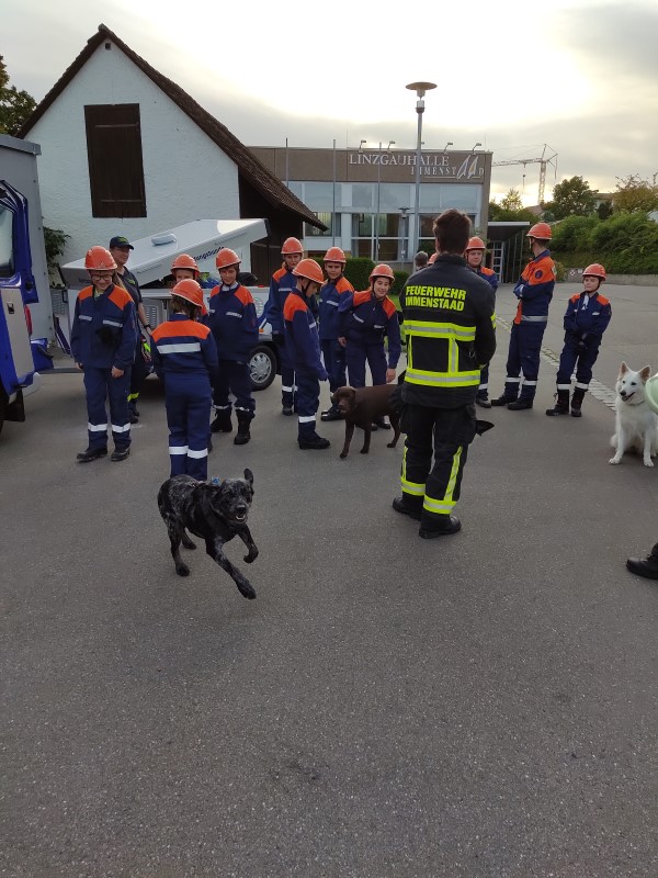 (MR) Diese Woche bekam unsere Jugendgruppe Besuch von den Mantrailern des THW Ortsverein Friedrichshafen. Die Hundeführer erklärten und zeigten uns alles rund um die Organisation, Einsatzvorgehen, Ausrüstung und Ausbildung in diesem speziellen Bereich. Unsere Jugendlichen fragten unseren Freunden vom THW hierzu fleißig Löcher in den Bauch. Im zweiten Teil der Probe versteckten wir einige unserer Jugendlichen im Bereich um den Modellbootweiher und schickten die Hunde auf die Suche, die sich von ihrem Geruchssinn nicht beirren ließen und alle ausgebüxten Jugendfeuerwehrler zügig ausfindig machen konnten.